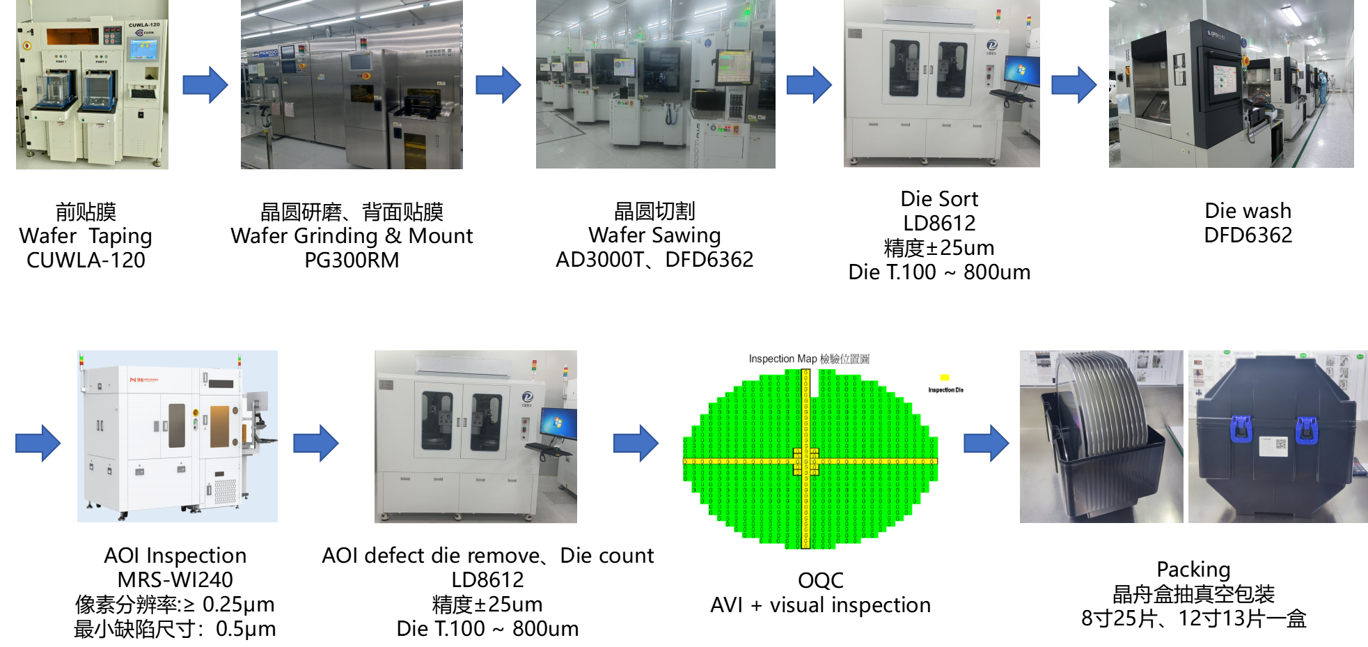 Recon Wafer Process(晶圓重構): 華宇電子提供專業(yè)的8英寸和12英寸Recon Wafer?服務,覆蓋從晶圓來料檢測到成品包裝的全流程。 ?