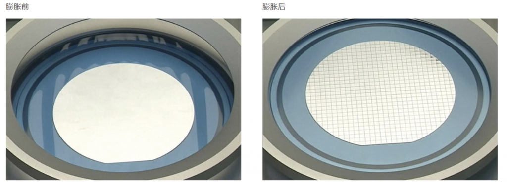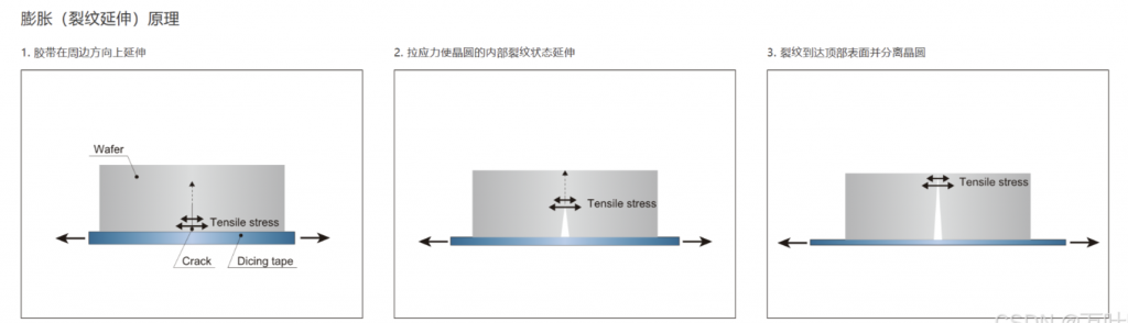 通過膠帶膨脹等行為在周邊方向上拉緊膠帶,對已形成 SD 層的晶圓施加外力。這會對晶圓的內(nèi)部裂紋狀態(tài)施加拉應(yīng)力,并使裂紋延伸到頂部和底部表面,從而分離晶片。由于晶圓分離是通過延伸裂紋進行的,因此沒有應(yīng)力施加在器件上。此外,由于基本上沒有截口損失,這會提高芯片成品率。