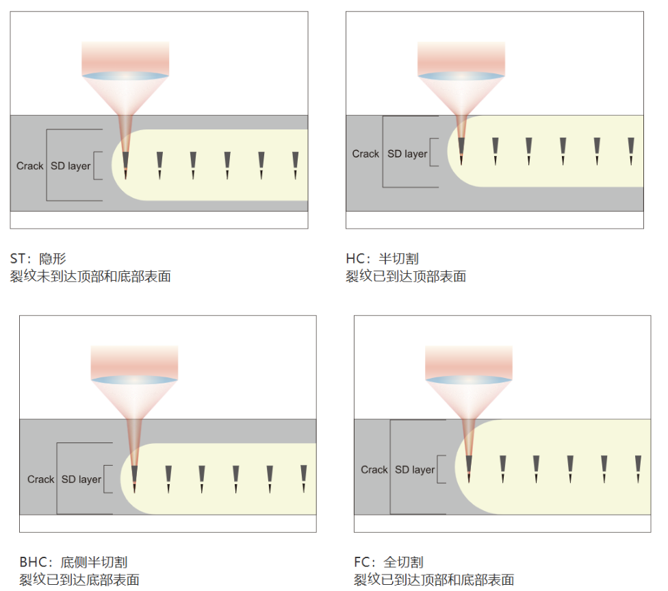 裂紋也從 SD 層形成,而 SD 層在內(nèi)部朝向晶圓的頂部和底部表面形成,這些裂紋通過激光光束掃描沿著計劃的切割線連接。此外,為了切割 MEMS 器件等厚晶圓,在厚度方向上形成多個 SD 層,然后連接裂紋。